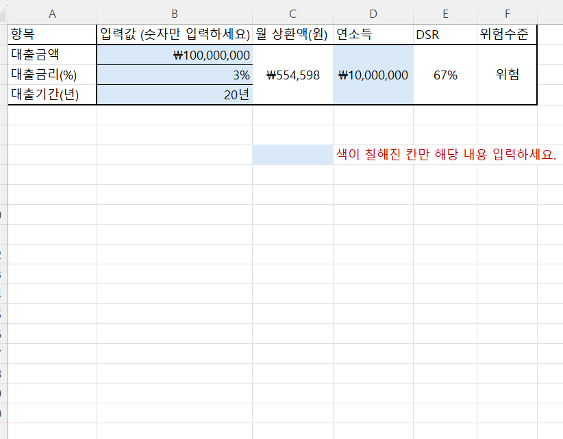 📂 DSR 계산기 다운로드 (파일 링크 추가) 직접 대출 금액 & 소득을 입력하면, 내 대출 위험 수준을 쉽게 체크할 수 있어요!
